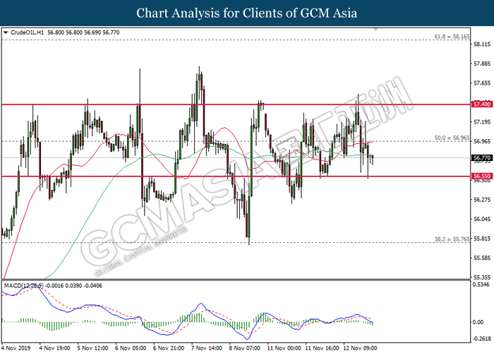 CrudeOIL, H1: Harga minyak mentah telah didagang dengan lebih rendah selepas ia berundur dari tahap rintangan 57.40. MACD yang memaparkan isyarat bearish mencadangkan harganya untuk meneruskan kerugian bagi jangka pendek dan menuju ke arah 56.55.