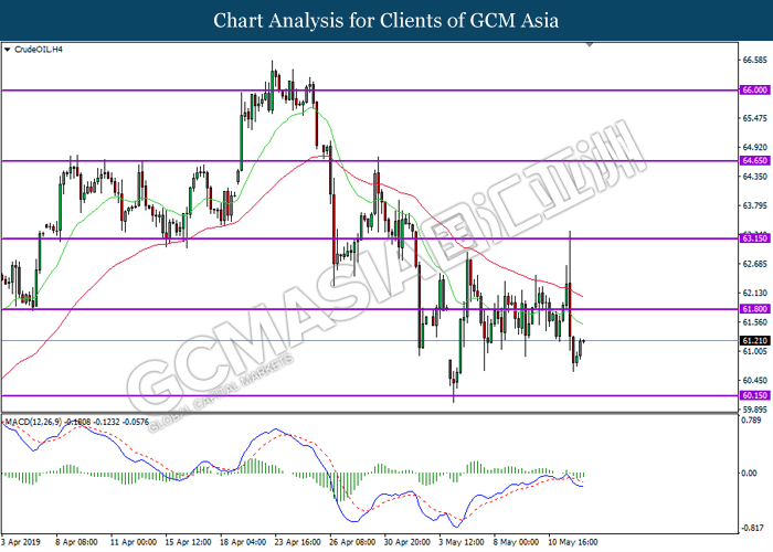 CrudeOIL, H4: Harga minyak mentah telah didagang dengan lebih tinggi berikutan dengan lantunan dari paras rendahnya. MACD yang menunjukkan momentum bearish yang berkurangan mencadangkan komoditi ini untuk melanjutkan lantunannya ke arah tahap rintangan di 61.80.