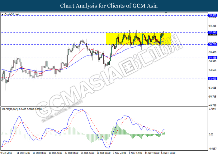 CrudeOIL, H4: Harga minyak mentah kekal didagang dalam saluran sisi sementara ia sedang menguji berhampiran dengan tahap rintangan 57.55. Namun, MACD yang memaparkan isyarat bias bullish dengan formasi silang emas mencadangkan komoditi ini untuk didagang dengan lebih tinggi selepas ia memecah tahap rintangan tersebut.
