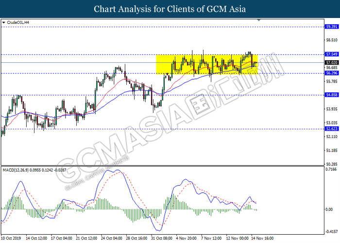 CrudeOIL, H4: Harga minyak mentah kekal didagang dalam saluran sisi berikutan dengan pengunduran dari tahap rintangan 57.55 baru-baru ini. Namun, MACD yang memaparkan isyarat momentum bearish mencadangkan komoditi ini untuk melanjutkan pengundurannya dalam jangka pendek ke arah tahap sokongan 56.30.