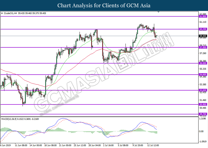 CrudeOIL, H4: Harga minyak mentah telah didagang dengan lebih rendah susulan dengan pemecahan dari tahap sokongan sebelumnya di 60.20. MACD yang menunjukkan momentum bearish mencadangkan komoditi ini untuk melanjutkan kerugiannya ke arah tahap sokongan 57.95.