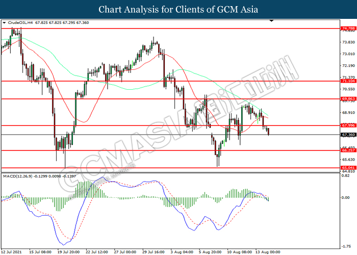 CrudeOIL, H4: Harga minyak mentah telah didagang dengan lebih rendah selepas ia memecah tahap sokongan terdahulu 68.00. MACD yang memaparkan momentum bearish mencadangkan komoditi ini untuk melanjutkan kerugiannya ke arah tahap sokongan 66.25.