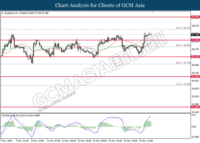 CrudeOIL, H1: Harga minyak mentah telah didagang dengan lebih rendah selepas ia berundur dari paras tingginya. MACD yang memaparkan penyusutan pada momentum menaik mencadangkan harganya untuk mengalami pembetulan teknikal bagi jangka pendek.