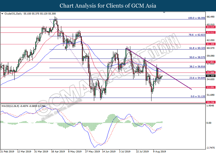 CrudeOIL, Daily: Harga minyak mentah telah didagang dengan lebih tinggi susulan dengan lantunan dari tahap sokongan 54.65. MACD yang menunjukkan momentum bullish mencadangkan komoditi ini untuk melanjutkan kenaikannya ke arah tahap rintangan 55.90.