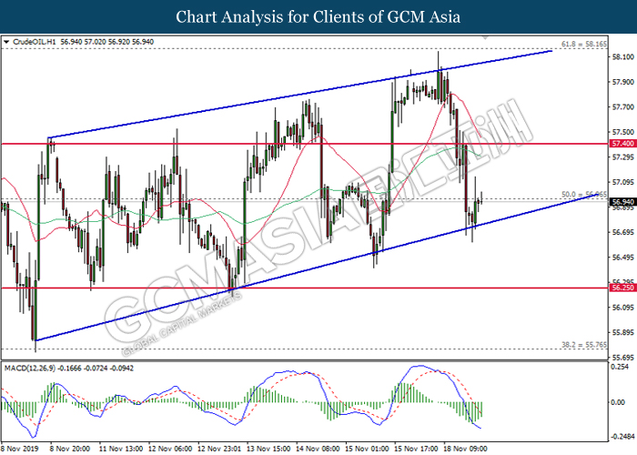 CrudeOIL, H1: Harga minyak mentah telah didagang dengan lebih tinggi selepas ia melantun dari paras bawahnya. MACD yang memaparkan penyusutan pada momentum menurun mencadangkan harganya untuk meneruskan kenaikannya selepas pemecahan berlaku di 56.95.