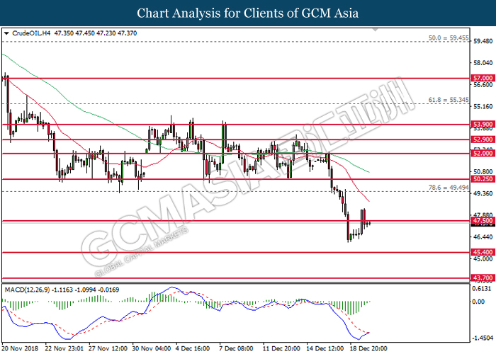 CrudeOIL, H4: Harga minyak mentah telah didagang dengan lebih tinggi selepas ia melantun dari paras rendah sebelumnya. MACD yang mula untuk membentuk corak silang emas mencadangkan harga komoditi ini untuk meningkat selanjutnya bagi jangka pendek sebagai pembetulan teknikal.