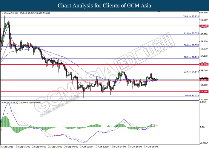 CrudeOIL, H4: Harga minyak mentah telah didagang dengan lebih rendah sementara ia sedang menguji tahap sokongan pada 53.55. MACD yang memaparkan penyusutan pada momentum menaik mencadangkan harganya untuk didagang dengan lebih rendah selepas ia berjaya memecah tahap sokongan di 53.55.