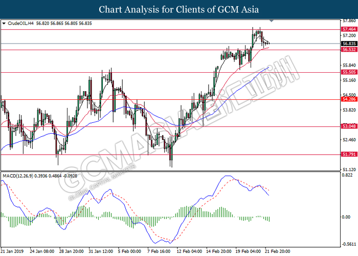 CrudeOIL, H4: Harga minyak mentah telah didagang dengan lebih tinggi selepas ia berundur dari tahap rintangan 57.45. MACD yang memaparkan momentum bearish serta silang kematian mencadangkan harganya untuk melanjutkan kerugian dan menuju ke arah 56.55.