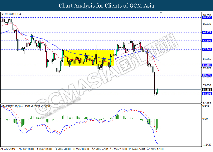 CrudeOIL, H4: Harga minyak mentah telah didagang dengan lebih tinggi berikutan dengan lantunan dari tahap sokongan di 58.10. MACD yang menunjukkan isyarat bias bullish mencadangkan komoditi ini untuk melanjutkan lantunannya ke arah tahap rintangan 60.10.
