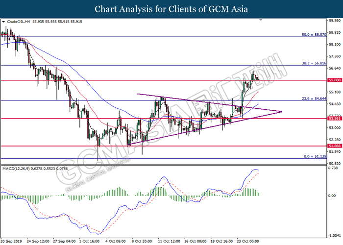 CrudeOIL, H4: Harga minyak mentah telah didagang dengan lebih rendah sementara ia sedang menguji tahap sokongan di 55.90. MACD yang memaparkan isyarat momentum bullish yang telah berkurangan mencadangkan komoditi ini untuk didagang dengan lebih rendah selepas ia berjaya memecah tahap sokongan pada 55.90.