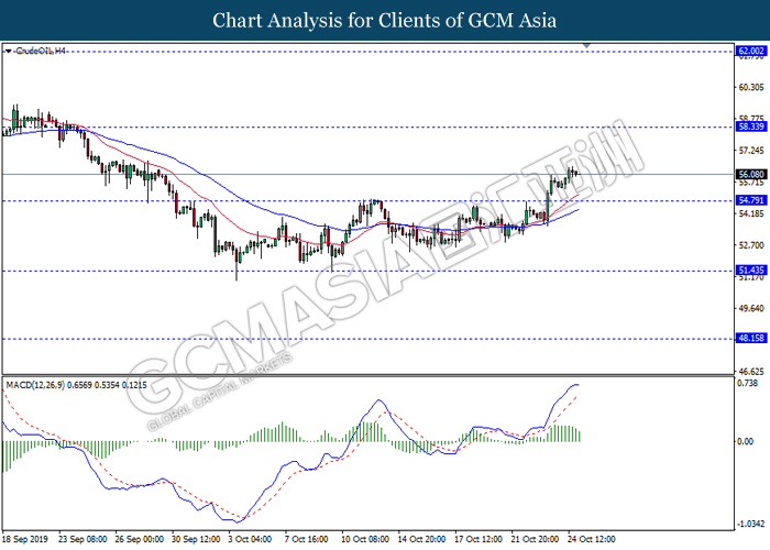 CrudeOIL, H4: Harga minyak mentah telah didagang dengan lebih tinggi berikutan dengan pemecahan pada tahap rintangan sebelumnya 54.80. Namun, MACD yang memaparkan isyarat momentum buliish yang telah berkurangan mencadangkan komoditi ini untuk didagang dengan lebih rendah sebagai pembetulan teknikal jangka pendek ke arah tahap sokongan 54.80.