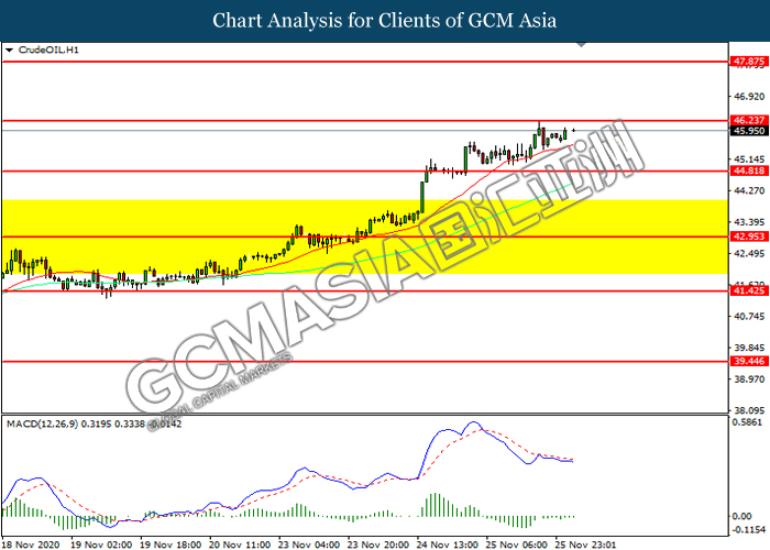 CrudeOIL, H1: Harga minyak mentah telah didagang dengan lebih tinggi sementara kini menguji di tahap rintangan 46.25. MACD yang memaparkan momentum bearish yang berkurangan mencadangkan komoditi ini untuk melanjutkan keuntungannya selepas ia memecah tahap rintangan tersebut.