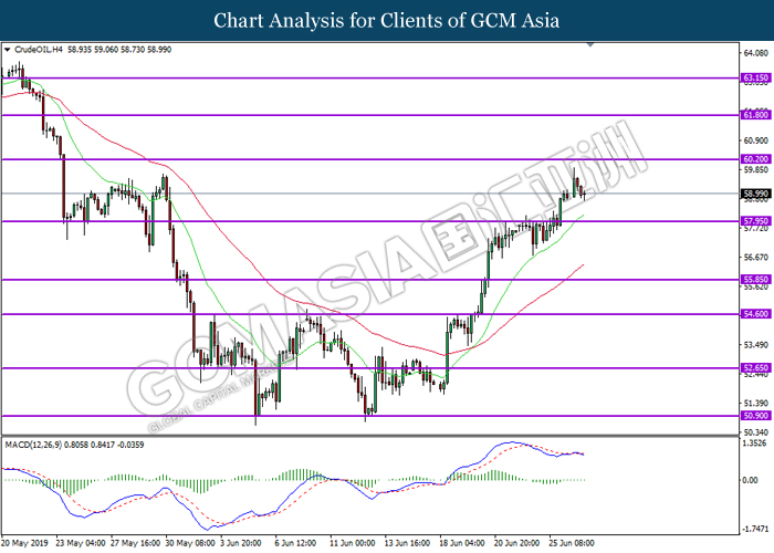 CrudeOIL, H4: Harga minyak mentah telah didagang dengan lebih rendah berikutan dengan pengunduran berdekatan tahap rintangan di 60.20. MACD yang menunjukkan penyusutan pada momentum bullish mencadangkan komoditi ini untuk melanjutkan pengundurannya ke arah tahap sokongan di 57.95.