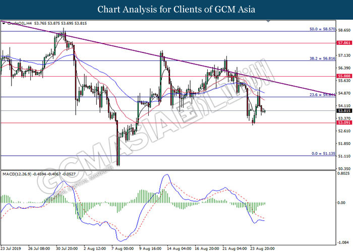 CrudeOIL, H4: Harga minyak mentah telah didagang dengan lebih tinggi susulan dengan lantunan dari paras rendahnya. MACD yang menunjukkan penyusutan pada momentum bearish mencadangkan komoditi ini untuk melanjutkan keuntungannya ke arah tahap rintangan 54.65.