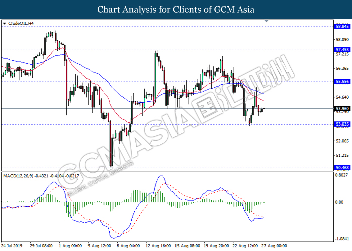 CrudeOIL, H4: Harga minyak mentah telah didagang dengan lebih tinggi berikutan dengan lantunan dari paras rendahnya. MACD yang memaparkan isyarat bias bullish dengan formasi silang emas mencadangkan komoditi ini untuk melanjutkan lantunannya ke arah tahap rintangan 55.55.