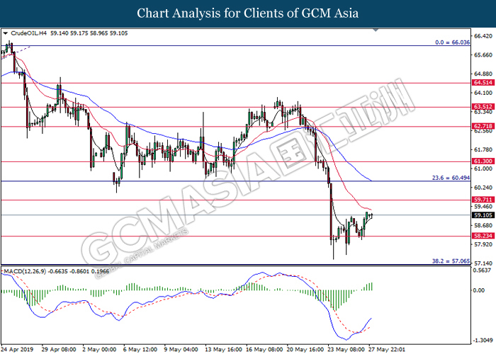 CrudeOIL, H4: Harga minyak mentah telah didagang dengan lebih tinggi sementara menguji pada garisan MA-20 (merah). MACD yang menunjukkan isyarat bias bullish mencadangkan komoditi ini untuk melanjutkan kenaikannya selepas ia berjaya untuk memecahkan pada garisan MA-20 tersebut.