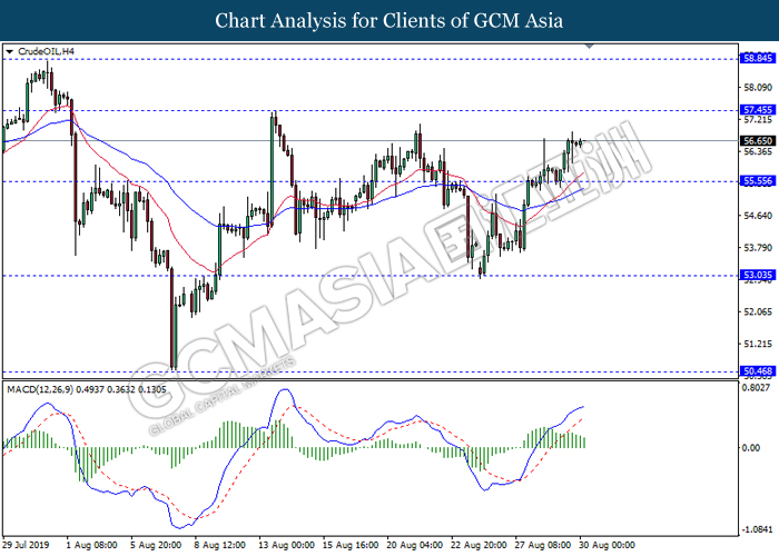CrudeOIL, H4: Harga minyak mentah telah didagang dengan lebih tinggi berikutan dengan lantunan dari tahap sokongan 55.55. Namun, MACD yang memaparkan isyarat momentum bullish yang telah berkurangan mencadangkan komoditi ini untuk mengalami pembetulan teknikal jangka pendek ke arah tahap sokongan 55.55.
