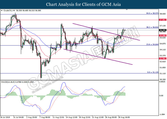 CrudeOIL, H4: Harga minyak mentah telah didagang dengan lebih rendah berikutan dengan pengunduran dari tahap rintangan 56.80. MACD yang memaparkan isyarat momentum bullish yang berkurangan mencadangkan komoditi ini untuk melanjutkan kerugiannya ke arah tahap sokongan 55.90.