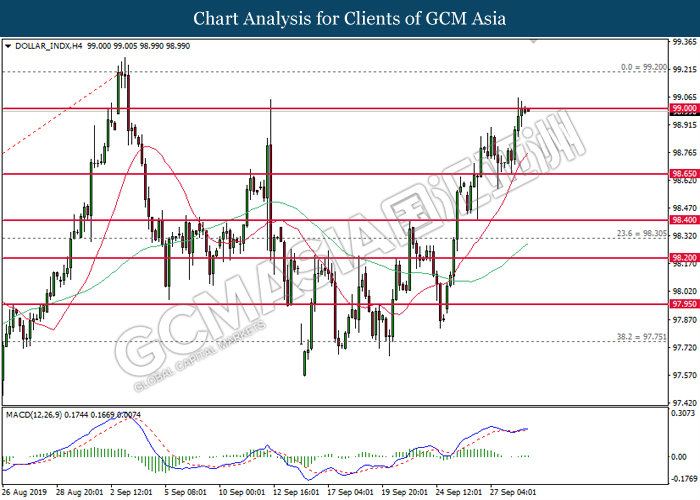 DOLLAR_INDX, H4: Indeks dolar telah didagang dengan lebih tinggi sementara kini menguji di 99.00. MACD yang memaparkan isyarat bullish mencadangkan indeks ini untuk meningkat selepas pemecahan berlaku di sasaran 99.00.