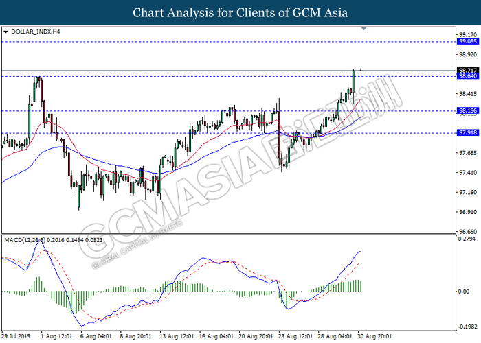 DOLLAR_INDX, H4: Indeks dolar telah didagang dengan lebih tinggi berikutan dengan pemecahan pada tahap rintangan sebelumnya 98.65. Namun, MACD yang memaparkan isyarat momentum bullish yang telah berkurangan mencadangkan dolar untuk mengalami pembetulan teknikal jangka pendek ke arah tahap sokongan 98.65.