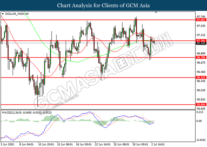 DOLLAR_INDX, H4: Indeks dolar telah didagang dengan lebih tinggi sementara kini menguji di tahap rintangan 97.20. MACD yang memaparkan momentum bearish yang berkurangan mencadangkan indeks tersebut untuk melanjutkan keuntungannya selepas ia memecah tahap rintangan tersebut.