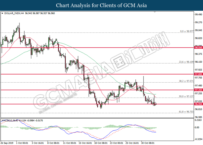 DOLLAR_INDX, H4: Indeks dolar telah didagang dengan lebih tinggi selepas ia melantun dari 96.95. MACD yang memaparkan penyusutan pada momentum menurun mencadangkan indeks ini untuk didagang dengan lebih tinggi bagi jangka pendek sebagai pembetulan teknikal.
