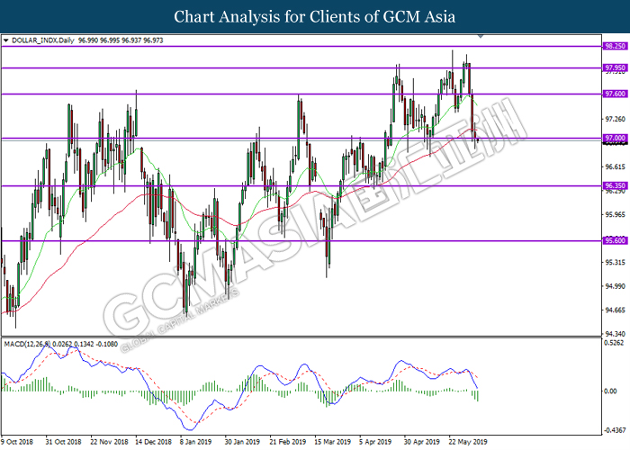 DOLLAR_INDX, Daily: Indeks dolar telah didagang dengan lebih rendah berikutan dengan pemecahan dari tahap sokongan sebelumnya di 97.00. MACD yang menunjukkan momentum bearish mencadangkan indeks untuk melanjutkan kerugiannya ke arah tahap sokongan di 96.35.