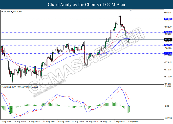 DOLLAR_INDX, H4: Indeks dolar telah didagang dengan lebih tinggi berikutan dengan lantunan dari tahap sokongan 98.20. MACD yang memaparkan isyarat momentum bearish yang telah berkurangan mencadangkan pasangan ini untuk melanjutkan lantunannya ke arah tahap rintangan 98.65.