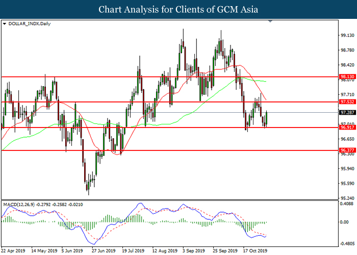 DOLLAR_INDX, Daily: Indeks dolar telah didagang dengan lebih tinggi selepas ia melantun dari tahap sokongan 96.90. MACD yang memaparkan momentum bearish yang berkurangan mencadangkan indeks ini untuk melanjutkan keuntungannya ke arah tahap rintangan 97.55.