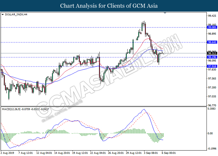 DOLLAR_INDX, H4: Indeks dolar telah didagang dengan lebih tinggi berikutan dengan pemecahan pada tahap rintangan sebelumnya 98.20. MACD yang memaparkan isyarat momentum bearish yang berkurangan mencadangkan dolar untuk melanjutkan keuntungannya ke arah tahap rintangan 98.65.
