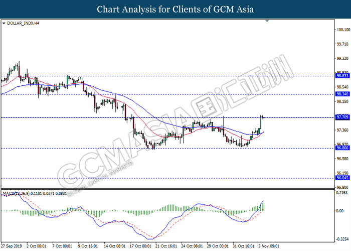 DOLLAR_INDX, H4: Indeks dolar telah didagang dengan lebih tinggi sementara ia sedang menguji tahap rintangan 97.70. MACD yang memaparkan isyarat momentum bullish yang berterusan mencadangkan dolar untuk melanjutkan keuntungannya selepas ia memecah tahap rintangan tersebut.