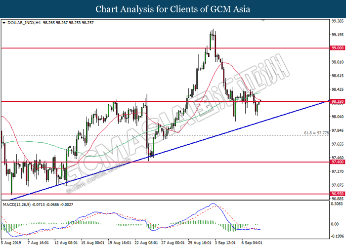 DOLLAR_INDX, H4: Indeks dolar telah didagang dengan lebih tinggi selepas ia melantun dari paras rendahnya. MACD yang mula untuk membentuk isyarat bullish mencadangkan indeks ini untuk meneruskan kenaikannya selepas pemecahan berlaku di 98.25.
