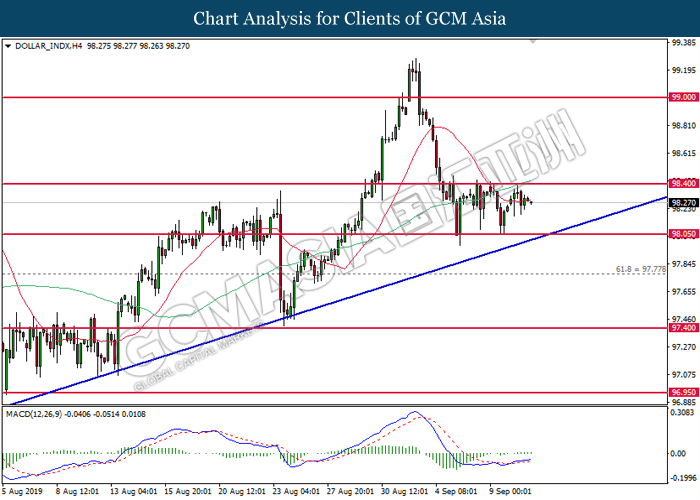 DOLLAR_INDX, H4: Indeks dolar kekal didagang di dalam formasi saluran sisi. MACD yang memaparkan penyusutan pada momentum menaik mencadangkan indeks ini untuk didagang dengan lebih rendah bagi jangka pendek sebagai pembetulan teknikal.