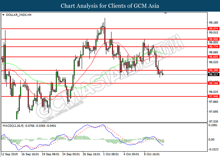DOLLAR_INDX, H4: Indeks dolar telah didagang dengan lebih rendah selepas ia berundur dari tahap rintangan 98.40. MACD yang memaparkan isyarat bias bearish mencadangkan pasangan ini untuk melanjutkan kerugiannya ke arah tahap sokongan 98.15.
