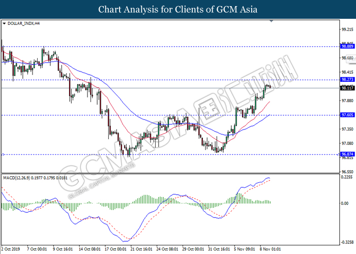 DOLLAR_INDX, H4: Indeks dolar telah didagang dengan lebih tinggi sementara ia sedang menguji berhampiran dengan tahap rintangan 98.25. Namun, MACD yang memaparkan isyarat momentum bullish yang telah berkurangan mencadangkan dolar untuk mengalami pembetulan teknikal ke arah tahap sokongan 97.60.