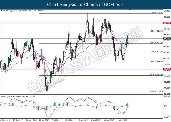 DOLLAR_INDX, Daily: Indeks dolar telah didagang dengan lebih tinggi selepas ia memecah tahap rintangan sebelumya di 97.75. MACD yang memaparkan momentum bullish mencadangkan indeks ini untuk melanjutkan keuntungannya ke arah tahap rintangan 98.35.