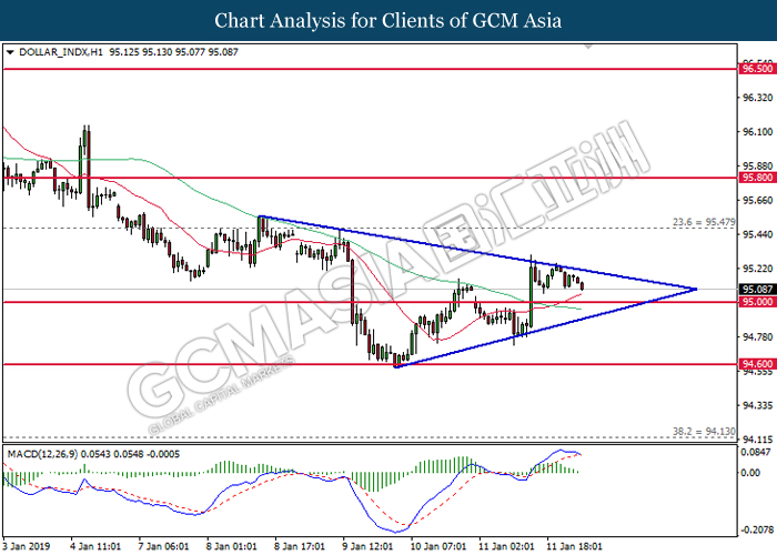 DOLLAR_INDX, H1: Indeks dolar kekal didagang di dalam segi tiga menyempit. MACD yang memaparkan penyusutan pada momentum menaik mencadangkan indeks ini untuk didagang dengan lebih rendah bagi jangka pendek sebagai pembetulan teknikal.