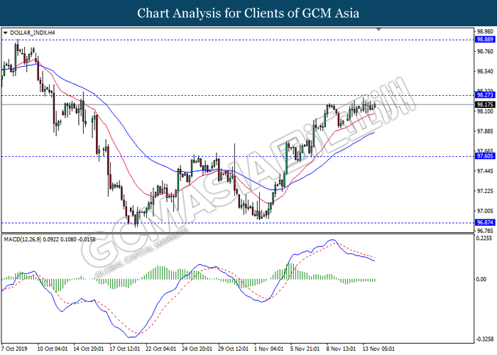 DOLLAR_INDX, H4: Indeks dolar telah didagang dengan lebih tinggi sementara ia sedang menguji berhampiran dengan tahap rintangan 98.25. Namun, MACD yang memaparkan isyarat momentum bearish mencadangkan dolar untuk mengalami pembetulan teknikal jangka pendek ke arah tahap sokongan 97.60.