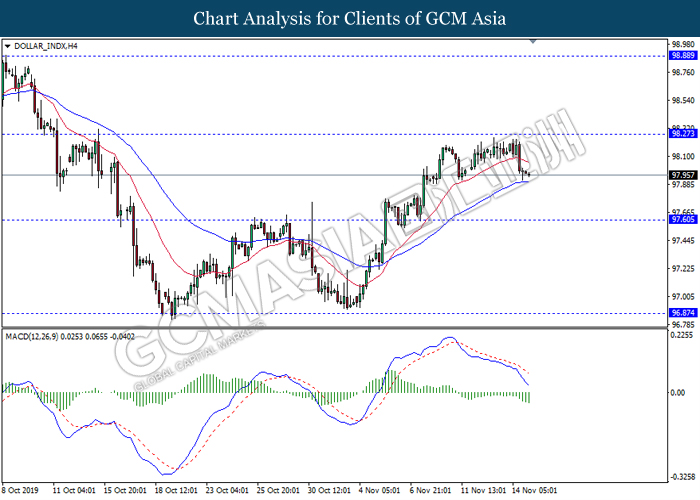 DOLLAR_INDX, H4: Indeks dolar telah didagang dengan lebih rendah berikutan dengan pengunduran dari tahap rintangan 98.25. MACD yang memaparkan isyarat momentum bearish yang berterusan mencadangkan dolar untuk melanjutkan kerugiannya ke arah tahap sokongan 97.60.