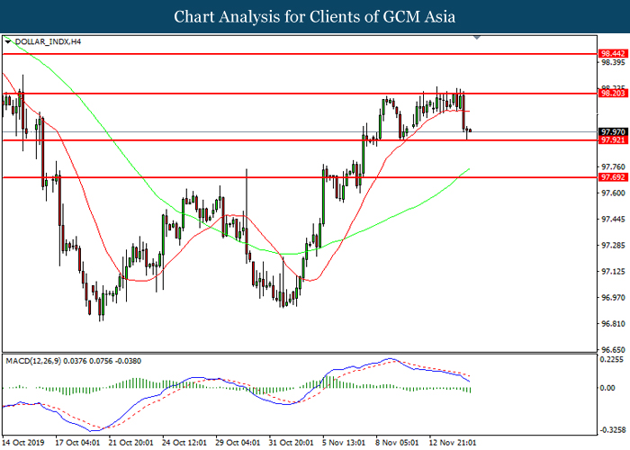 DOLLAR_INDX, H4: Indeks dolar telah didagang dengan lebih rendah sementara kini menguji di tahap sokongan 97.90. MACD yang memaparkan momentum bearish mencadangkan indeks tersebut untuk melanjutkan kerugiannya selepas ia memecah tahap sokongan tersebut.