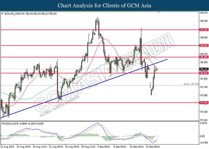 DOLLAR_INDX, H4: Indeks dolar telah didagang dengan lebih tinggi selepas ia melantun dari paras rendahnya. MACD yang memaparkan isyarat bullish mencadangkan indeks ini untuk meningkat selepas ia ditutup di atas garisan 20-MA (merah).