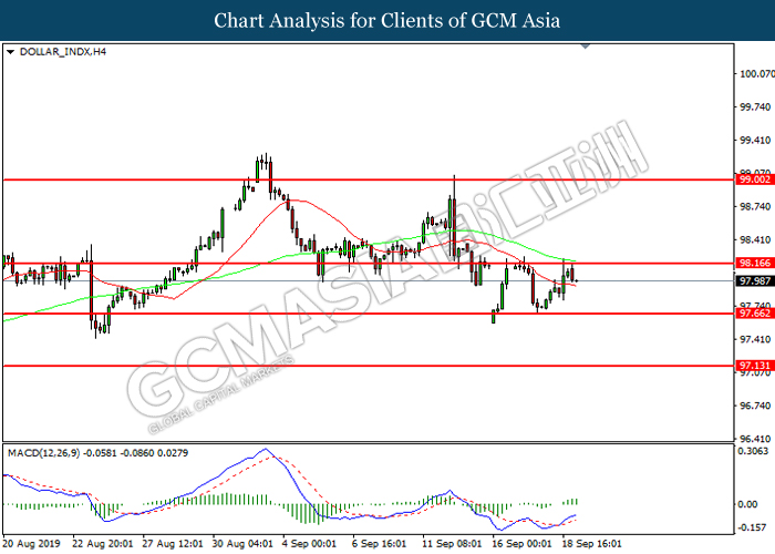 DOLLAR_INDX, H4: Indeks dolar telah didagang dengan lebih rendah selepas ia berundur dari tahap rintangan 98.15. Namun, MACD yang memaparkan momentum bullish mencadangkan pasangan ini untuk mencatat kenaikan untuk mengalami pembetulan teknikal jangka pendek.