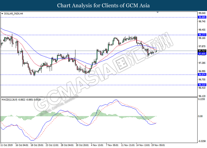 DOLLAR_INDX, H4: Indeks dolar telah didagang dengan lebih tinggi berikutan dengan lantunan dari tahap sokongan 97.60. MACD yang memaparkan isyarat bias bullish dengan permulaan formasi silang emas mencadangkan dolar untuk melanjutkan lantunannya ke arah tahap rintangan 98.25.