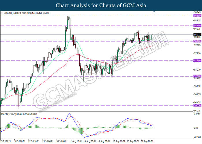 DOLLAR_INDX, H4: Indeks dolar telah didagang dengan lebih tinggi berikutan dengan lantunan daripada tahap sokongan 98.00. MACD yang menunjukkan isyarat bias bullish mencadangkan indeks untuk melanjutkan lantunannya ke arah tahap rintangan 98.40.