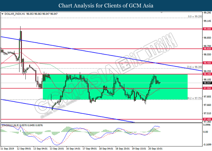 DOLLAR_INDX, H1: Indeks dolar kekal didagang di dalam saluran sisi. MACD yang memaparkan penyusutan pada momentum menaik mencadangkan indeks ini untuk didagang dengan lebih rendah bagi jangka pendek.