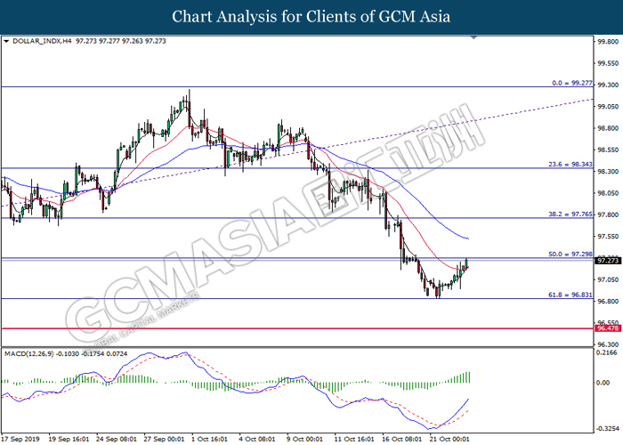 DOLLAR_INDX, H4: Indeks dolar telah didagang dengan lebih tinggi sementara ia sedang menguji tahap rintangan 97.30. MACD yang memaparkan momentum bullish mencadangkan indeks tersebut akan melanjutkan keuntungannya selepas ia berjaya memecah tahap rintangan 97.30.