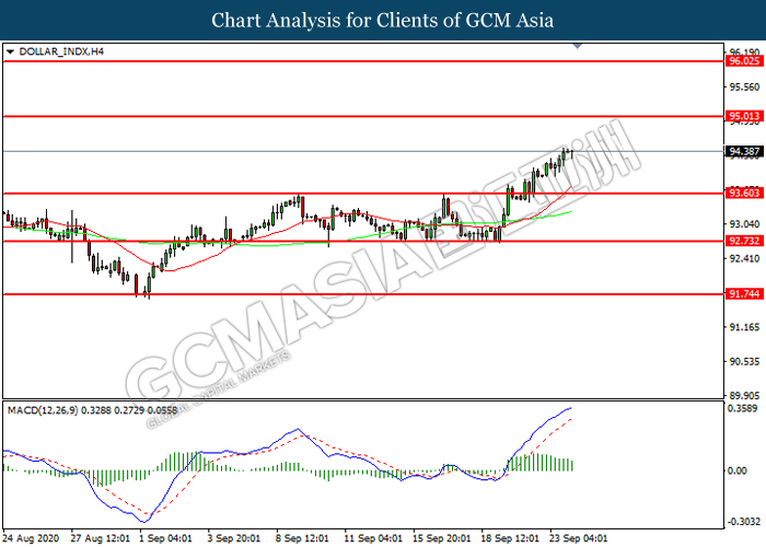 DOLLAR_INDX, H4: Indeks dolar telah didagang dengan lebih tinggi selepas ia memecah tahap rintangan terdahulu 93.60. Namun, MACD yang memaparkan momentum bullish yang berkurangan mencadangkan indeks tersebut untuk mengalami pembetulan teknikal bagi jangka pendek.