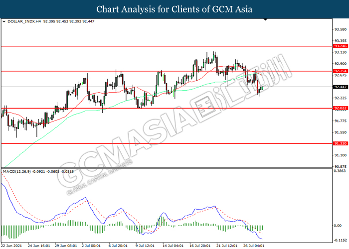 DOLLAR_INDX, H4: Indeks dolar telah didagang dengan lebih rendah selepas ia memecah tahap sokongan terdahulu 92.75. Namun, MACD yang memaparkan momentum bearish yang berkurangan mencadangkan indeks tersebut untuk mengalami pembetulan teknikal bagi jangka pendek.