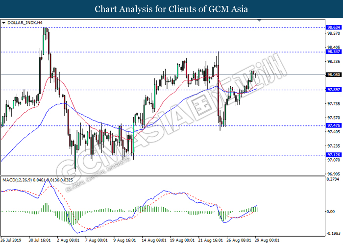 DOLLAR_INDX, H4: Indeks dolar telah didagang dengan lebih tinggi berikutan dengan pemecahan pada tahap rintangan sebelumnya 97.90. MACD yang memaparkan isyarat momentum bullish mencadangkan dolar untuk melanjutkan keuntungannya ke arah tahap rintangan 98.35.