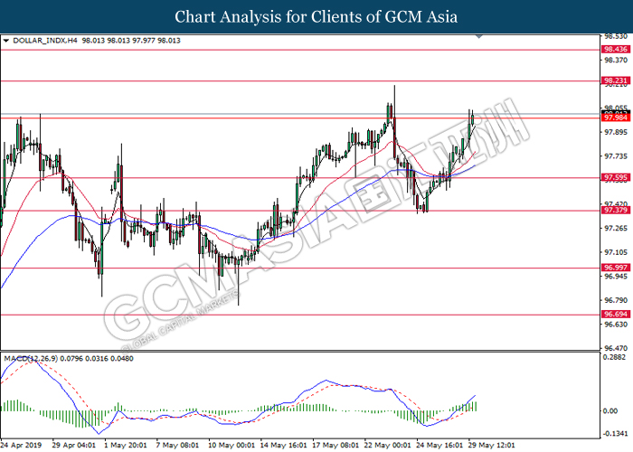 DOLLAR_INDX, H4: Indeks dolar telah didagang dengan lebih tinggi sementara menguji pada tahap rintangan di 98.00. MACD yang menunjukkan momentum bias bullish mencadangkan indeks untuk melanjutkan keuntungannya selepas ia berjaya untuk menutupkan lilinnya di atas tahap rintangan tersebut.